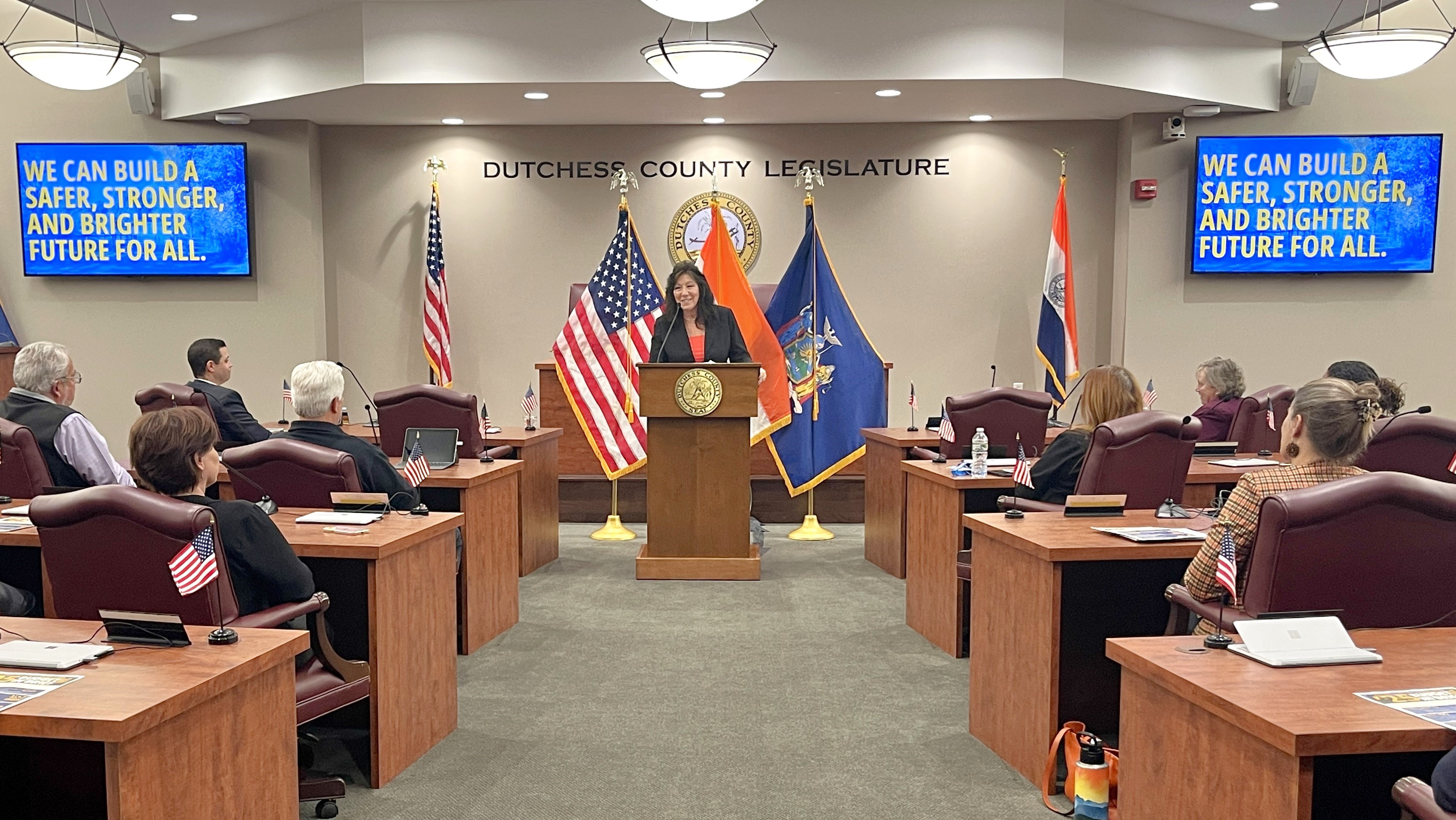 Poughkeepsie … Dutchess County Executive Sue Serino presented her 2025 Executive Budget proposal today to county officials and community leaders in the Dutchess County Legislature’s Chambers in the City of Poughkeepsie. The County Executive’s budget plan is focused on Building a Safer, Stronger, and Brighter Future with key investments in public safety, youth services and support for seniors, veterans and families, while staying well under the New York State property tax cap.