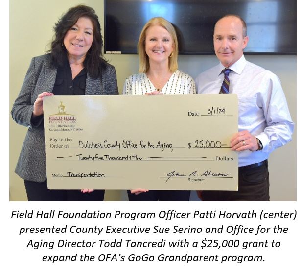 Thanks to a new $25,000 grant from the Field Hall Foundation, as well as a $20,000 grant from the New York State Office for the Aging, Dutchess County’s GoGo Grandparents program will serve even more seniors in 2024. The additional grant funding will allow OFA to explore expanding the scope of the GoGo Grandparent partnership, including the possibility of offering rides to seniors to visit a loved one in a hospital or nursing home; OFA has received feedback from clients who do not currently have transportation for this type of visitation.