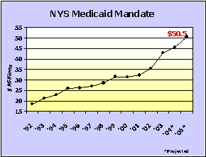 Once again we are faced with annual double-digit Medicaid increase, with costs for 2005 projected at over $50 million, an increase of more than 10% over our 2004 projected cost. This brings the total 5-year mandated increase in the County share to a stunning $19 million. In early October 2004, our weekly Medicaid payment rose to an all time high of $1.5 million, and an average of $132,000 every day for this one state-mandated program. In another five years, if reform is not enacted, our mandated Medicaid costs will likely reach an astonishing $83 million per year or nearly $1.6 million per week from our treasury.