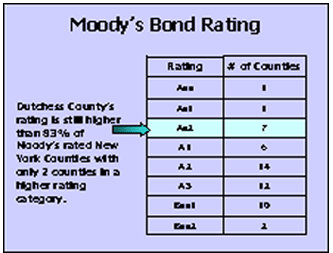 The good news is while the rating is slightly less than the County’s previous level of Aa1 in 2003, Aa2 nonetheless confirms the County’s enviable standing in the Aa credit category. Dutchess County’s rating is still higher than 83% of Moody’s rated New York Counties with only two counties in a higher rating category.