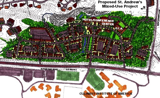A proposed residential development on the eastern border of Red Hook Village is being planned with village-scale lots. An environmental impact statement in Hyde Park shows a mixed-use residential development across from the CIA in which half the acreage remains open and 10 percent of the housing will be available for moderate-income households (see below). These high-quality, planned developments exemplify high standards that towns are beginning to insist upon and that we at the county believe are essential to our future.