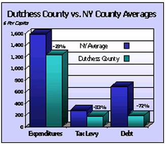 However, based on statistical data, published recently by the State Comptroller and reflected in the graph to the right, Dutchess County taxes its residents 33% less per capita and spends 23% less per capita than the statewide county average. Dutchess County’s indebtedness per capita is an impressive 72% below the statewide county average. Of particular importance to Dutchess County property taxpayers, the county property tax levy totals only 22% of the County’s constitutional taxing limit.