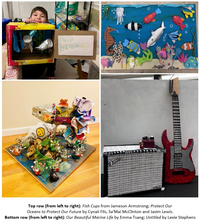 Winner: Cynaii Fils, Sa'Mai McClinton and Jasim Lewis of Ms. Kathleen Orza's 5th Grade class, Warring Elementary School, Protect Our Oceans to Protect Our Future, an underwater scene depicting ocean life, made using water bottles, tissue paper and other recyclable materials.