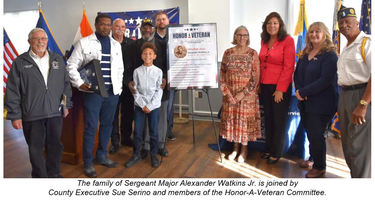 POUGHKEEPSIE, NY – Dutchess County Executive Sue Serino and the County’s Office of Veterans Affairs honored the service and legacy of U.S. Army Sergeant Major Alex Watkins Jr., a former City of Poughkeepsie resident, during today’s “Honor-A-Veteran” ceremony. Today’s tribute, held at American Legion Post 1302 in Poughkeepsie, was part of a monthly series dedicated to commemorating the lives and sacrifices of Dutchess County veterans who have passed, recognizing their enduring contributions to the nation and community.