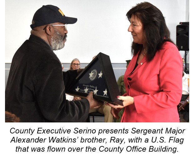Dutchess County Executive Sue Serino said, “Alexander Watkins proudly served in the U.S. Army for nearly three decades, earning respect for his hard work and bravery. He was much more than a soldier, though. He was a caring father, a proud grandfather and a strong, honest man who made a lasting impact on everyone who knew him. Dutchess County is proud to celebrate the life and service of Alexander and his fellow American heroes through our ‘Honor-A-Veteran’ ceremonies.”