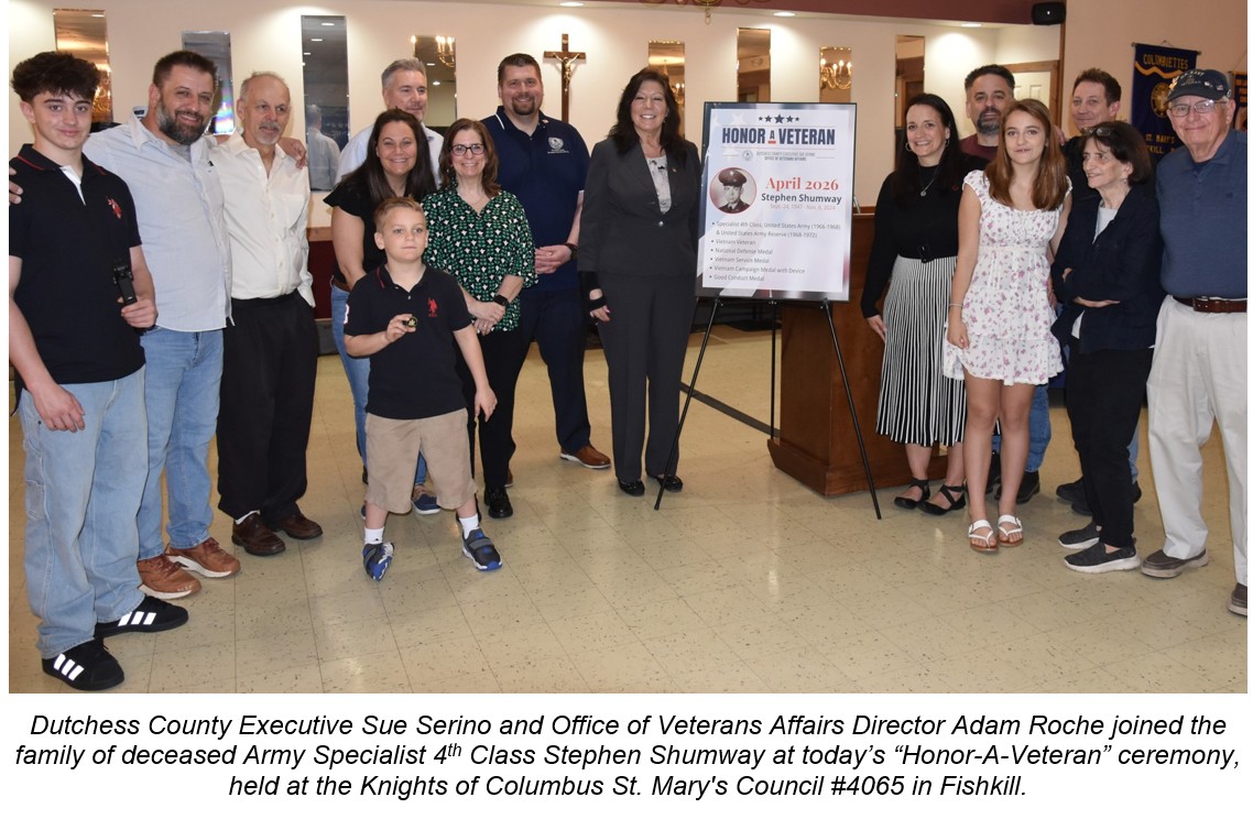 POUGHKEEPSIE, NY – Dutchess County Executive Sue Serino and the County’s Office of Veterans Affairs today recognized the military service and life of U.S. Army Specialist 4th Class Stephen John Shumway, a former Town of Fishkill resident, at the County’s first “Honor-A-Veteran” ceremony of 2026.