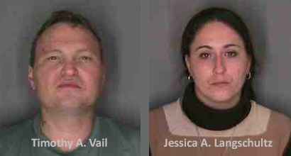 On the above date and time, a Deputy observed a vehicle traveling westbound on Fulton St with no front license plate, and also observed the vehicle make a right hand turn onto Route 9 without signaling. The vehicle was then stopped on Route 9, at which time the operator was identified as Timothy A. Vail (age 43 of Hyde Park) and the passenger was identified as Jessica A. Langschultz (age 30 of Poughquag). After further interviews and investigation, both were found to allegedly be in possession of controlled substances; Vail was found to be in possession of someone else’s Oxycodone pills, and Langschultz heroin.